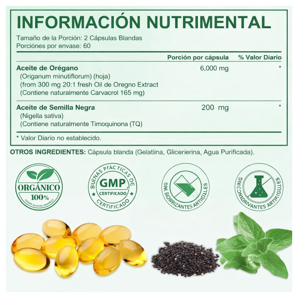 La diferencia radica en su pureza y potencia. Cada cápsula ofrece una concentración masiva de 165 mg de Carvacrol, equivalente a 6000 mg de orégano, combinada con aceite de semilla negra prensado en frío. Esta sinergia única maximiza la biodisponibilidad, garantizando que tu cuerpo absorba cada nutriente eficazmente.