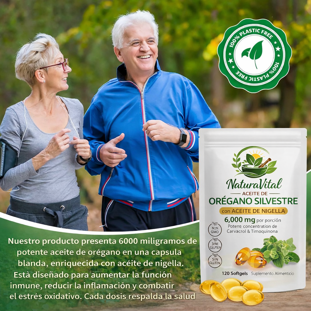 Actúa como un escudo natural de doble acción. Mientras el orégano silvestre aporta antioxidantes potentes para neutralizar radicales libres, el aceite de comino negro fortalece tu sistema inmunológico. Juntos, te mantienen resiliente y protegido frente a las amenazas del entorno, permitiéndote mantener tu ritmo de vida sin interrupciones.